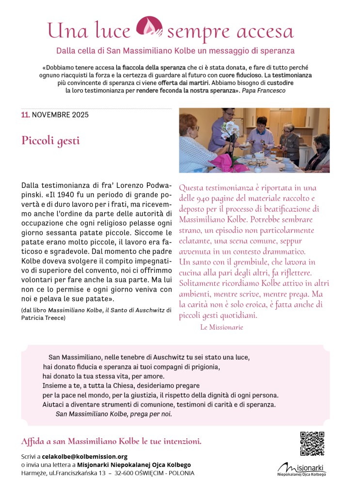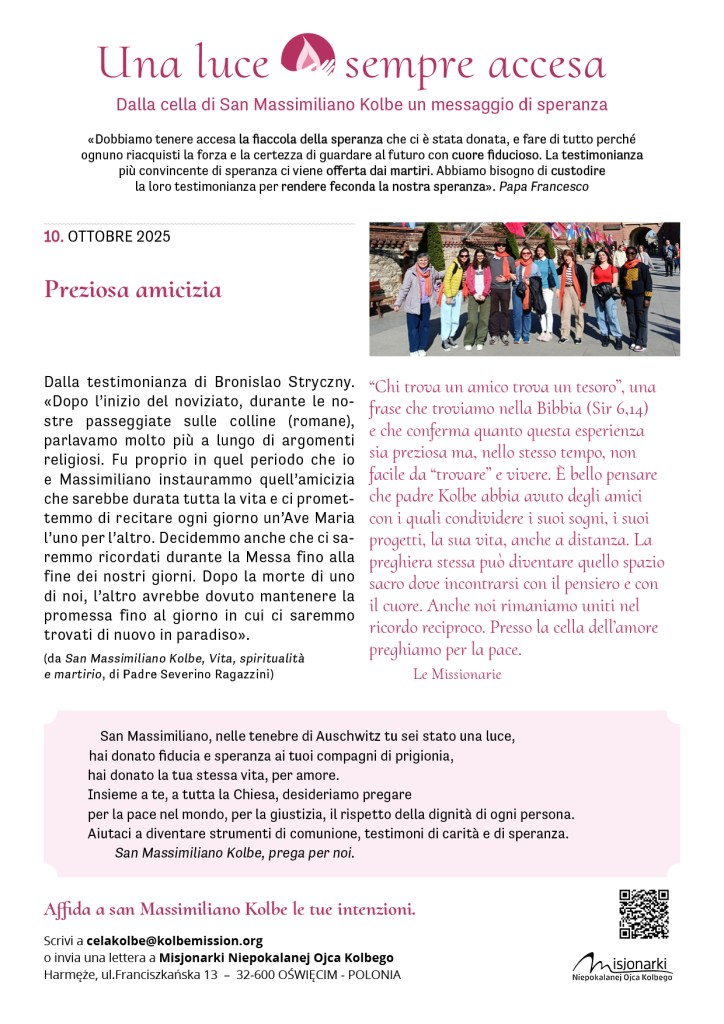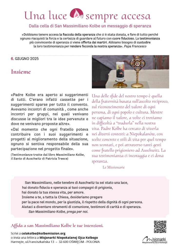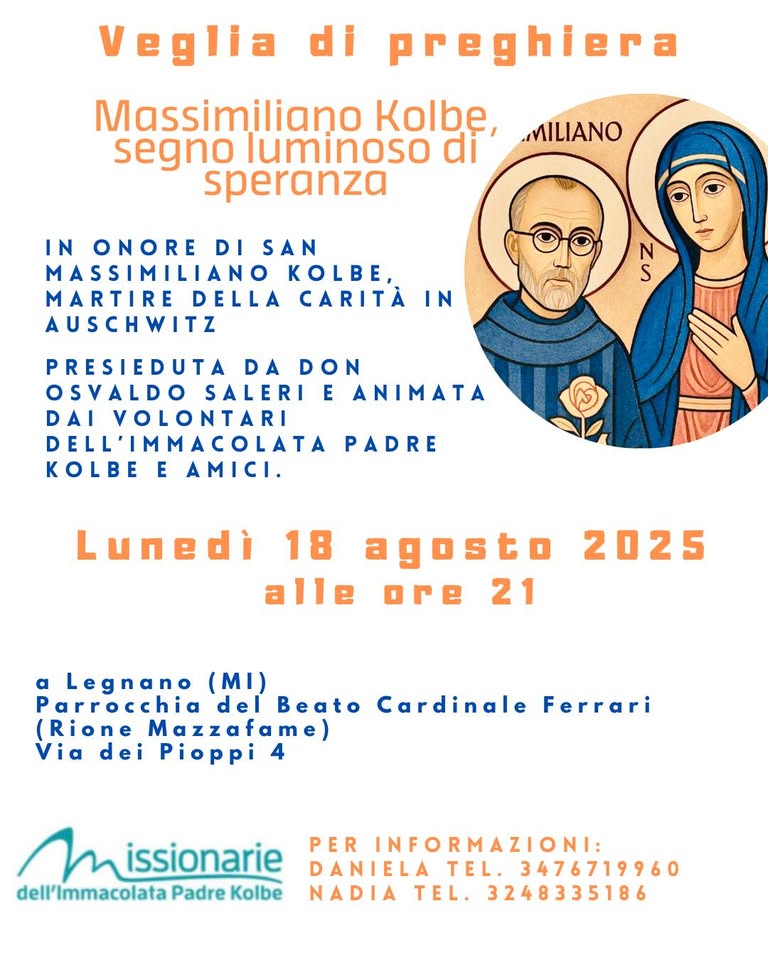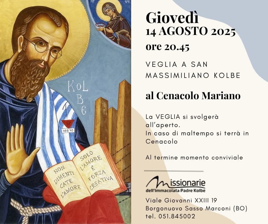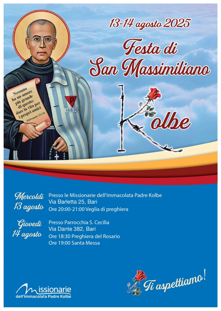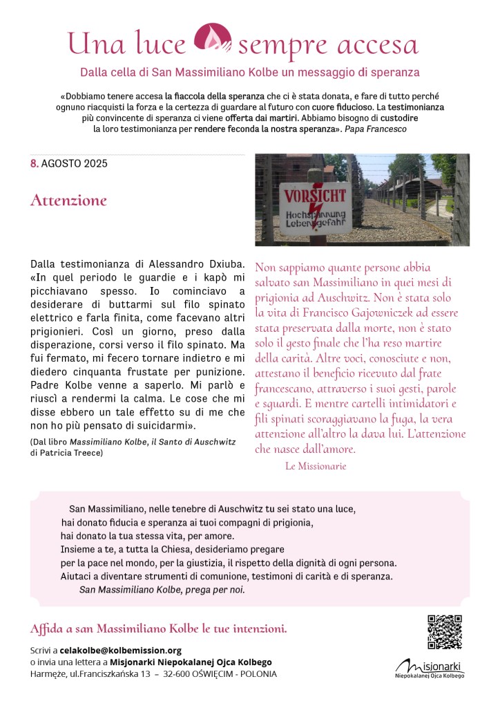 Fra pochi giorni ricorderemo il martirio di padre Kolbe. Molti di noi si sono recati – in questi mesi o negli anni scorsi – presso la sua cella, ad Auschwitz, un’esperienza che ha lasciato il segno. In Italia, le missionarie e i volontari vivranno in questi giorni diversi momenti di preghiera. Siamo tutti invitati, se possibile e se vicino, a partecipare.