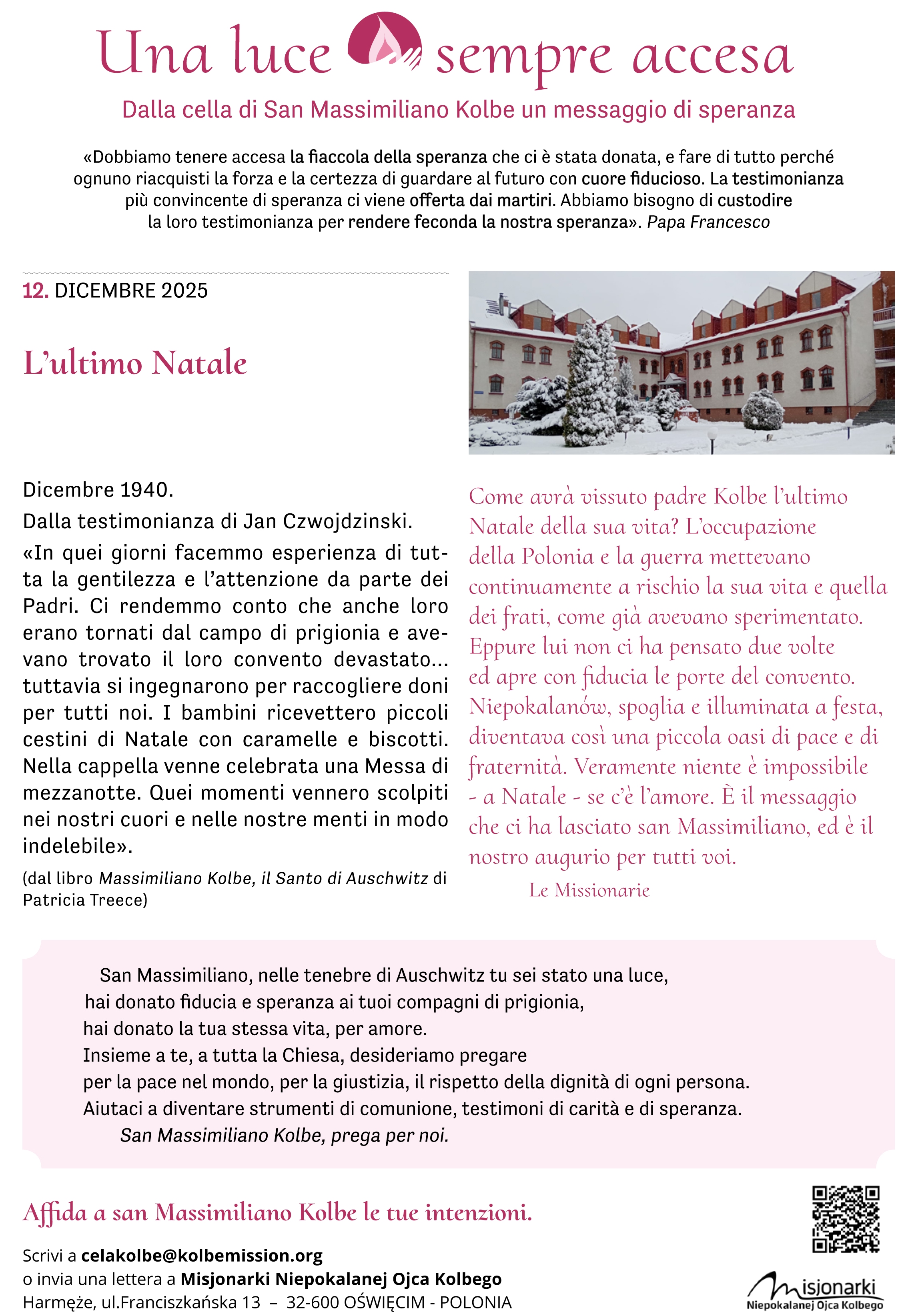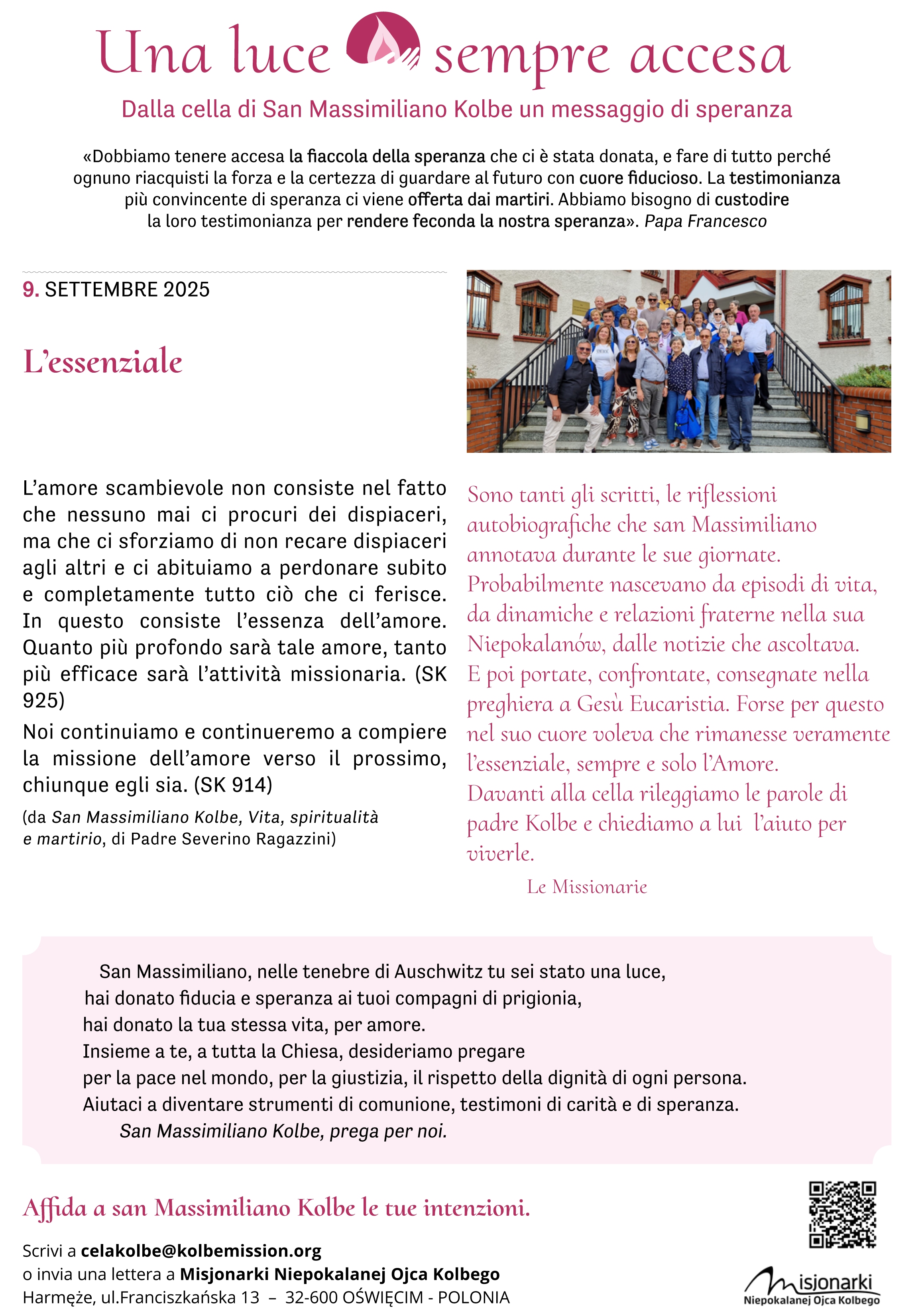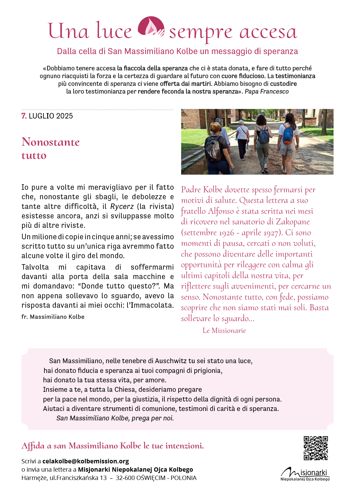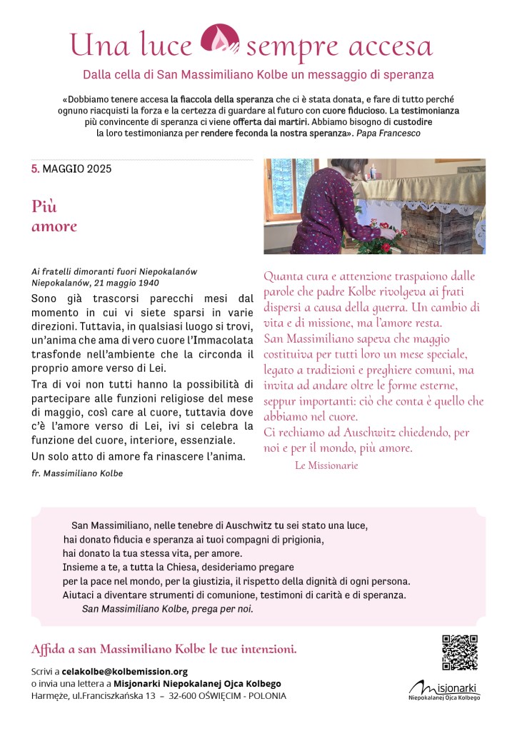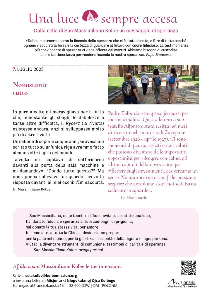 Fra pochi giorni ricorderemo il martirio di padre Kolbe. Molti di noi si sono recati – in questi mesi o negli anni scorsi – presso la sua cella, ad Auschwitz, un’esperienza che ha lasciato il segno. In Italia, le missionarie e i volontari vivranno in questi giorni diversi momenti di preghiera. Siamo tutti invitati, se possibile e se vicino, a partecipare.