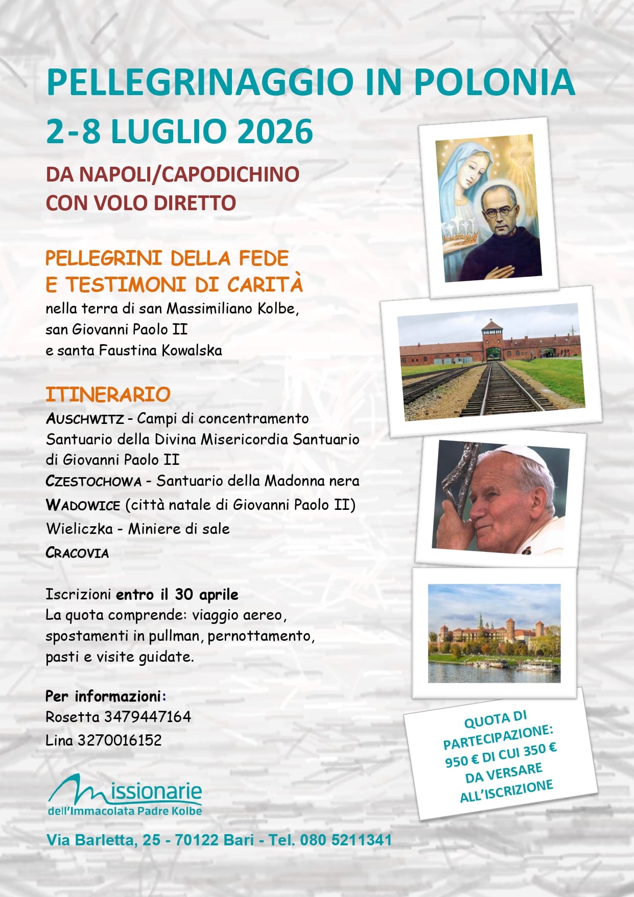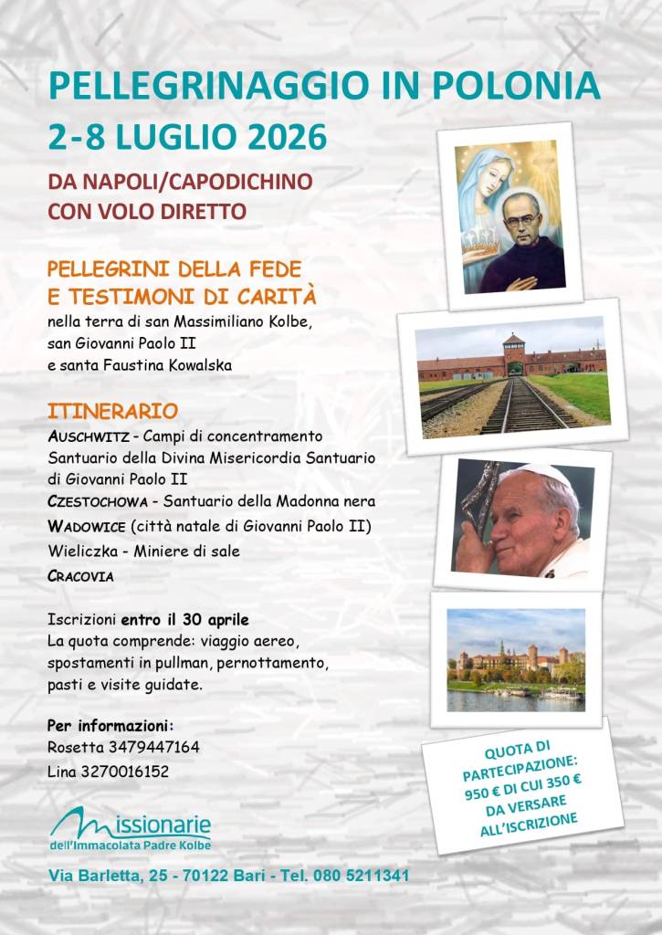 Si è concluso da poco il pellegrinaggio in Polonia, con la guida delle missionarie Dora e Angelina e con la presenza dell’assistente della Milizia dell’Immacolata don Mimmo, parroco della Chiesa Buon Pastore di Barletta. Abbiamo non solo visitato ma “vissuto” luoghi che ci hanno parlato al cuore e hanno vivificato il nostro cammino di fede, dando il giusto valore alla vita e ai doni che il Signore ci fa. Sono luoghi di sofferenza ma anche di tanta santità. La visita dei campi di sterminio di Auschwitz e Birkenau ci ha condotto a riflettere sulla brutalità dell’uomo, che apparentemente è lontana, ma alberga dentro di noi e che rischia di ripetersi anche oggi in gesti di odio e di prevaricazione.